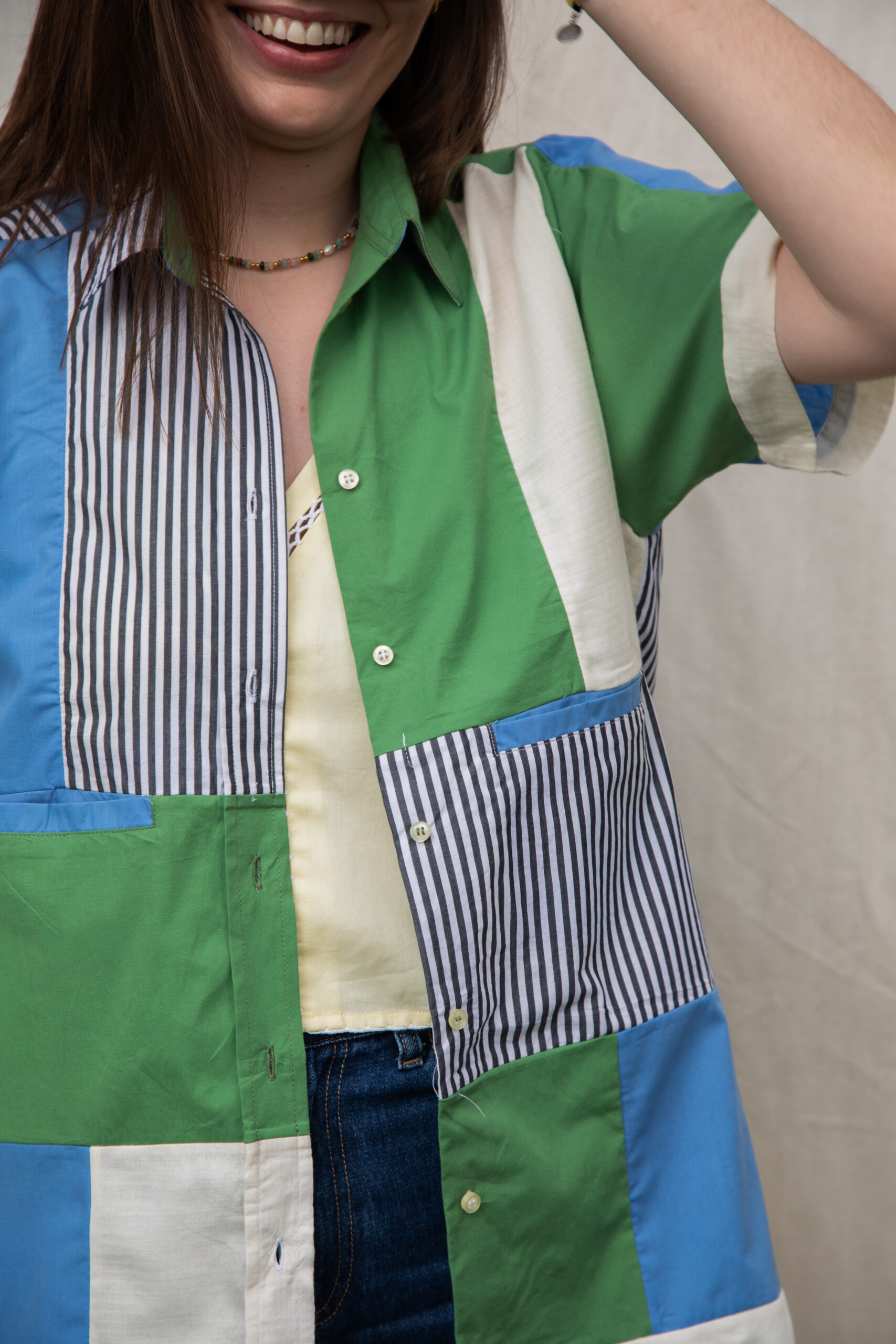 La Blouse Santatra en patchwork de coton se distingue par son col boutonné, ses manches courtes retournées et ses finitions soignées. Sa poche plaquée à rabat brodée et ses deux poches passepoilées sont la signature de ce modèle.