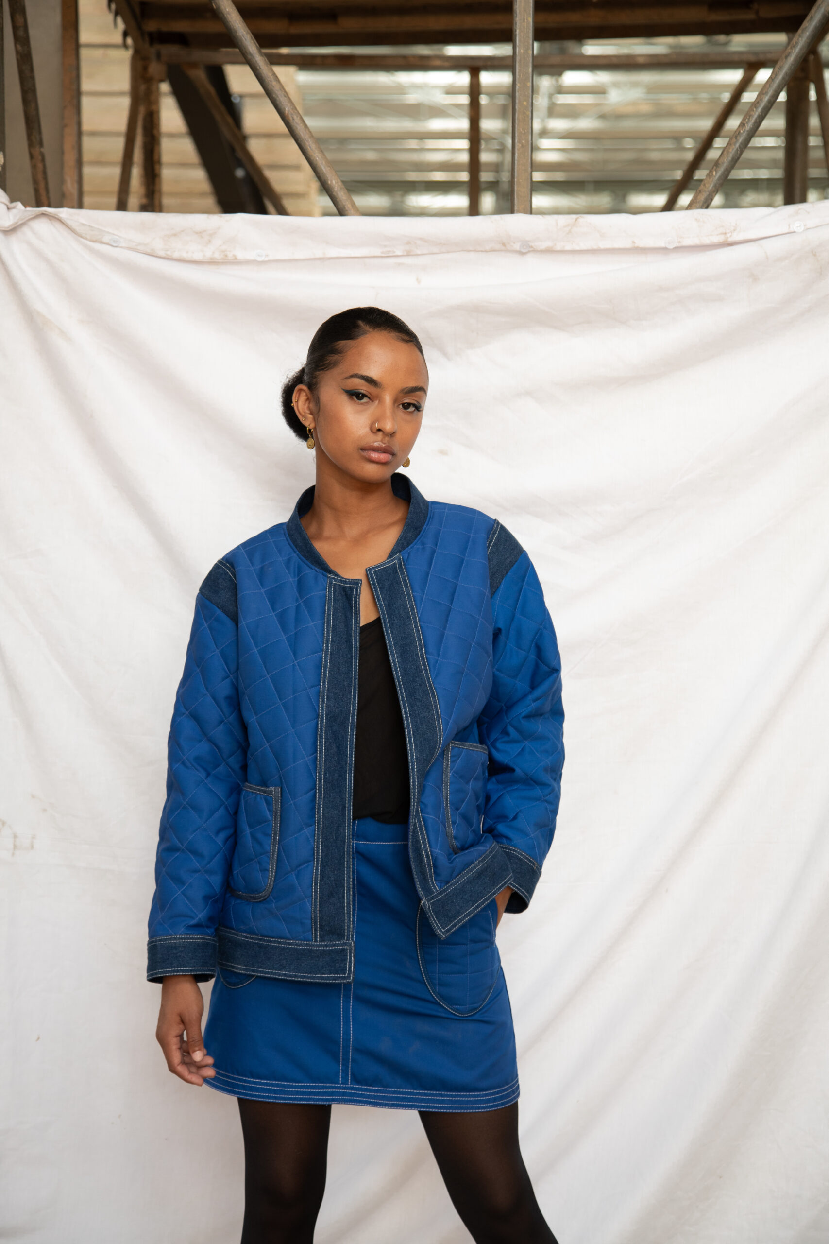– Denim upcyclé, issues de friperies locales (des nuances de couleur peuvent apparaitre d’une pièce à l’autre)