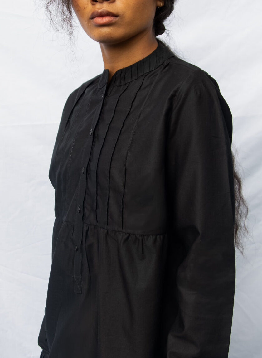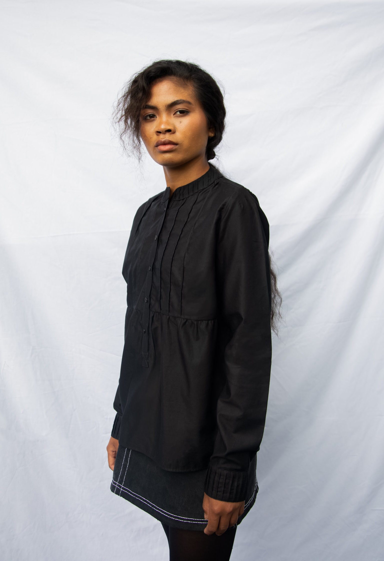 La Chemise Talia est une chemise col Mao avec petits plis au col et aux poignets.