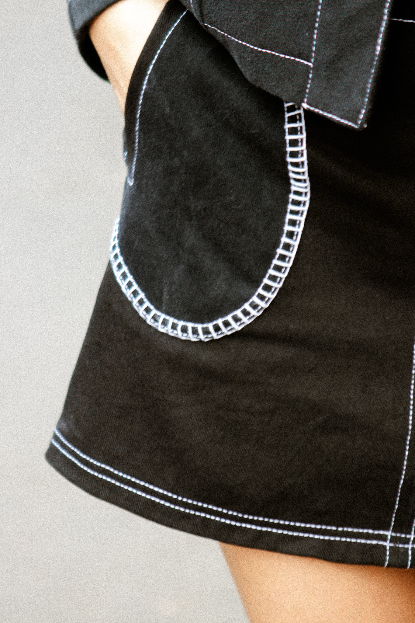 Tout comme la veste Lova, la jupe Tantely est une variante plus rehaussée en noir-crochet de la jupe Lily.