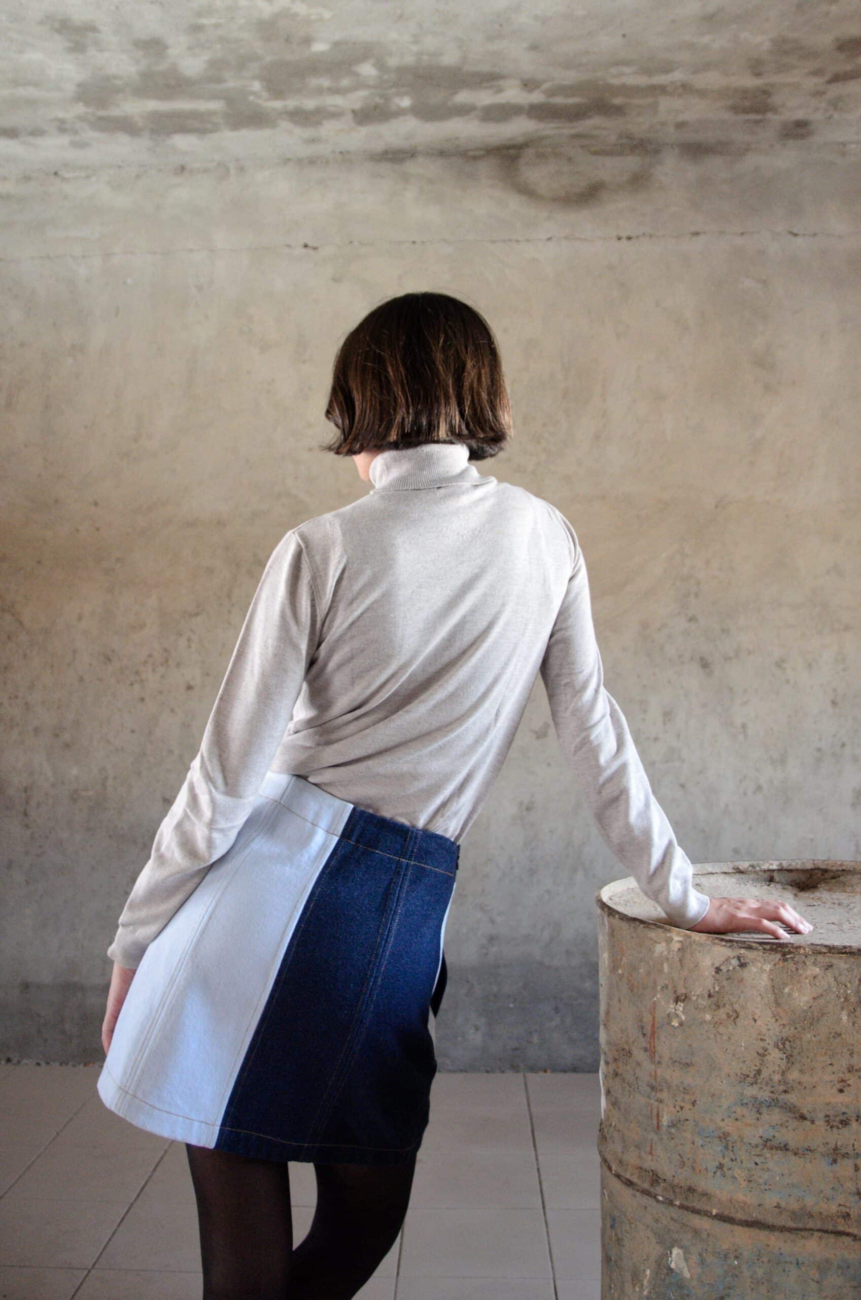 Jupe trapèze en patchwork de denim bicolore contrasté, réalisée à partir de chutes de jeans, à l’esprit 70’s.