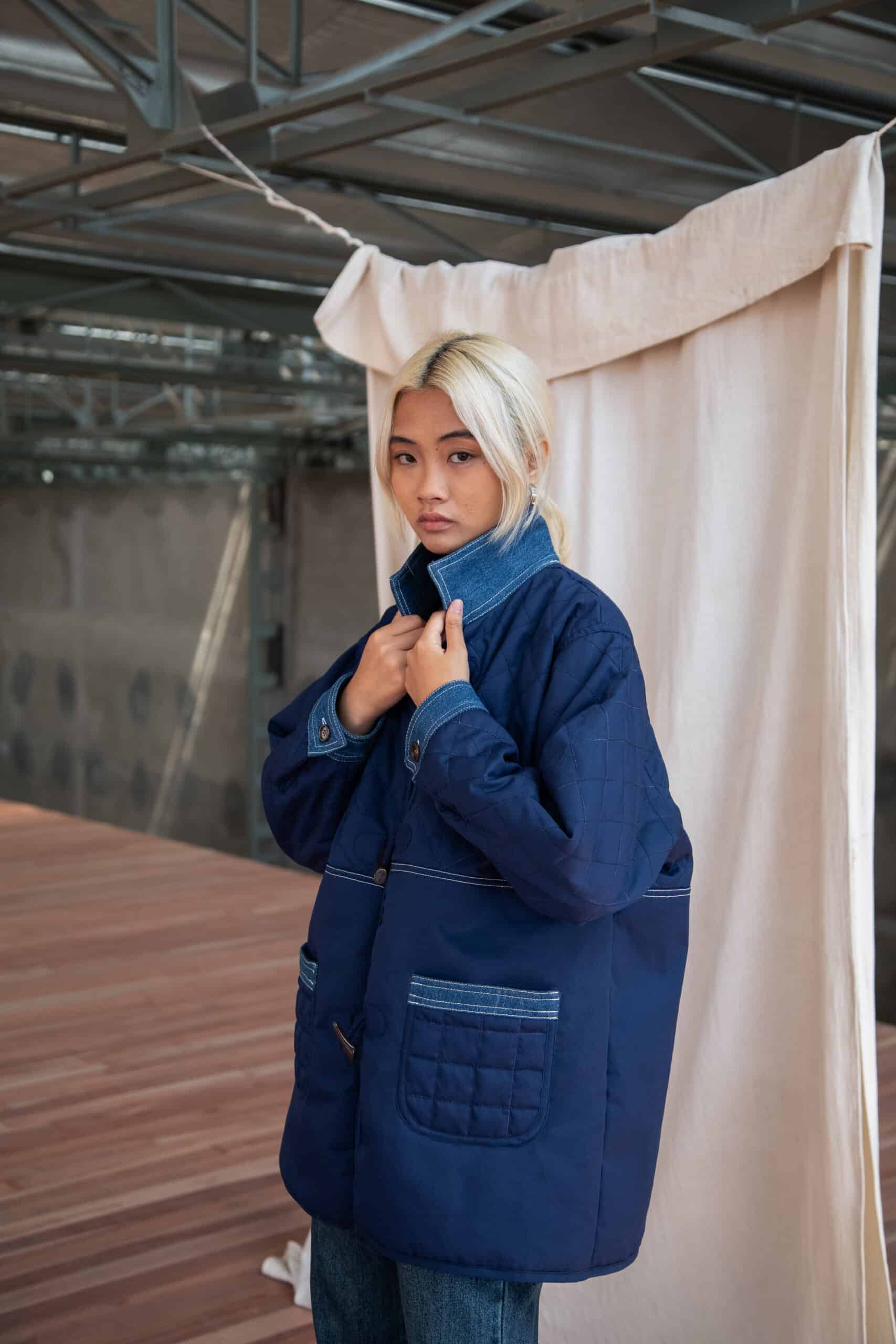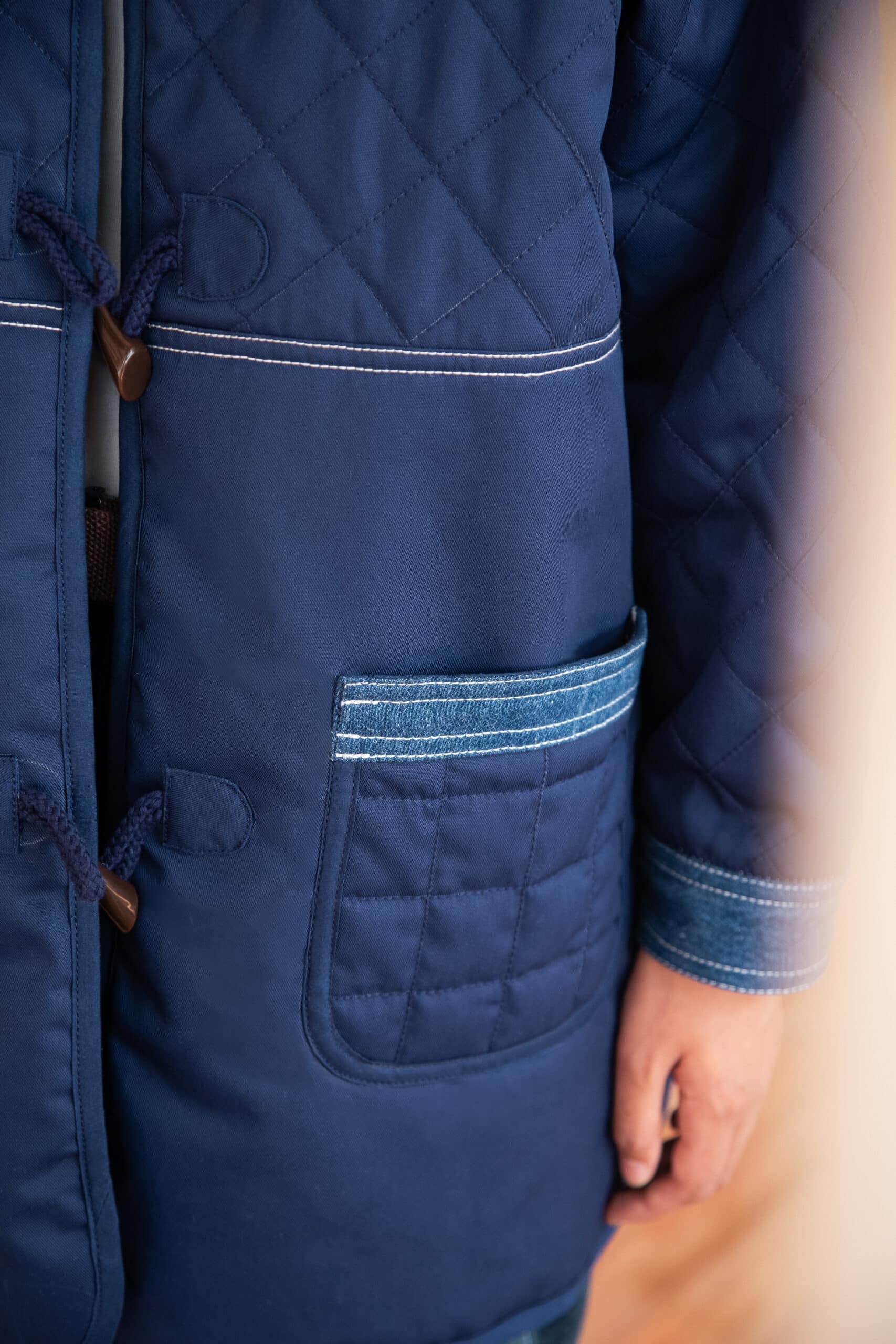 Le manteau ARO Denim est un manteau mi-long en tissu Workwear matelassé, détails en denim.