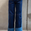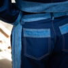– Denim upcyclé, issues de friperies locales (des nuances de couleur peuvent apparaitre d’une pièce à l’autre)