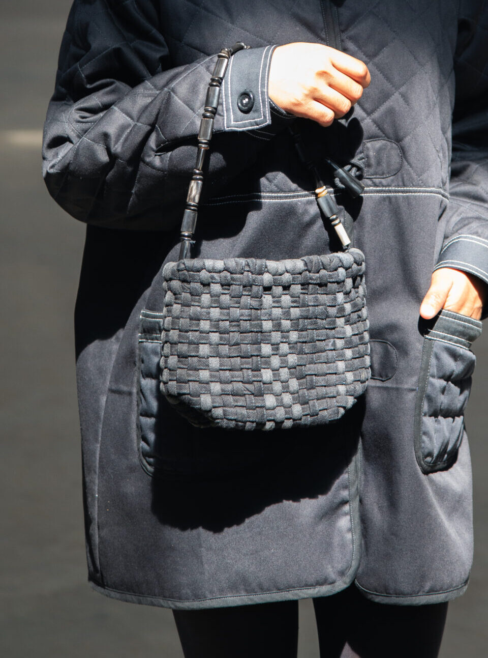Confectionnés à partir de nos propres chutes de denim, nos sacs sont tissés en lacets pour créer une matière résistante aux nuances de bleu variées.