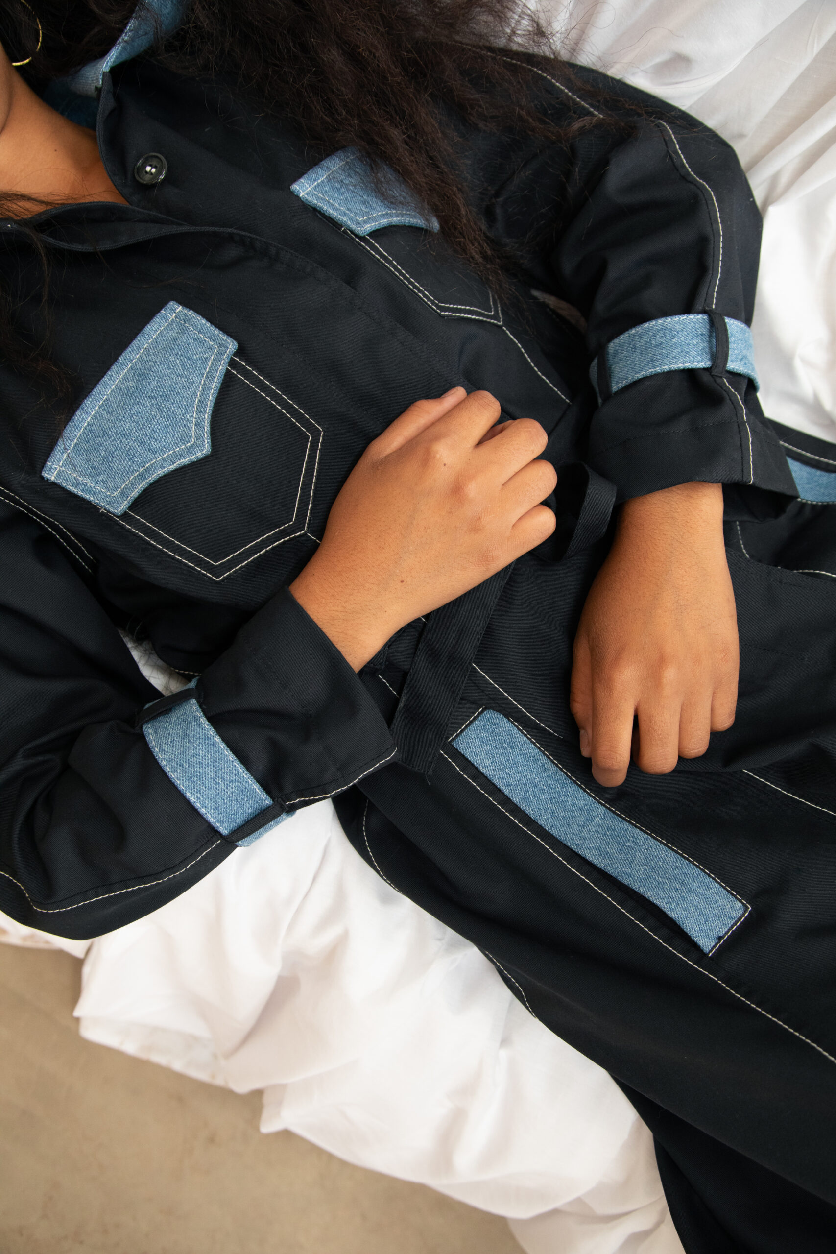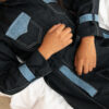 – Denim en rappel sur le col, les poches et les pattes de poignets