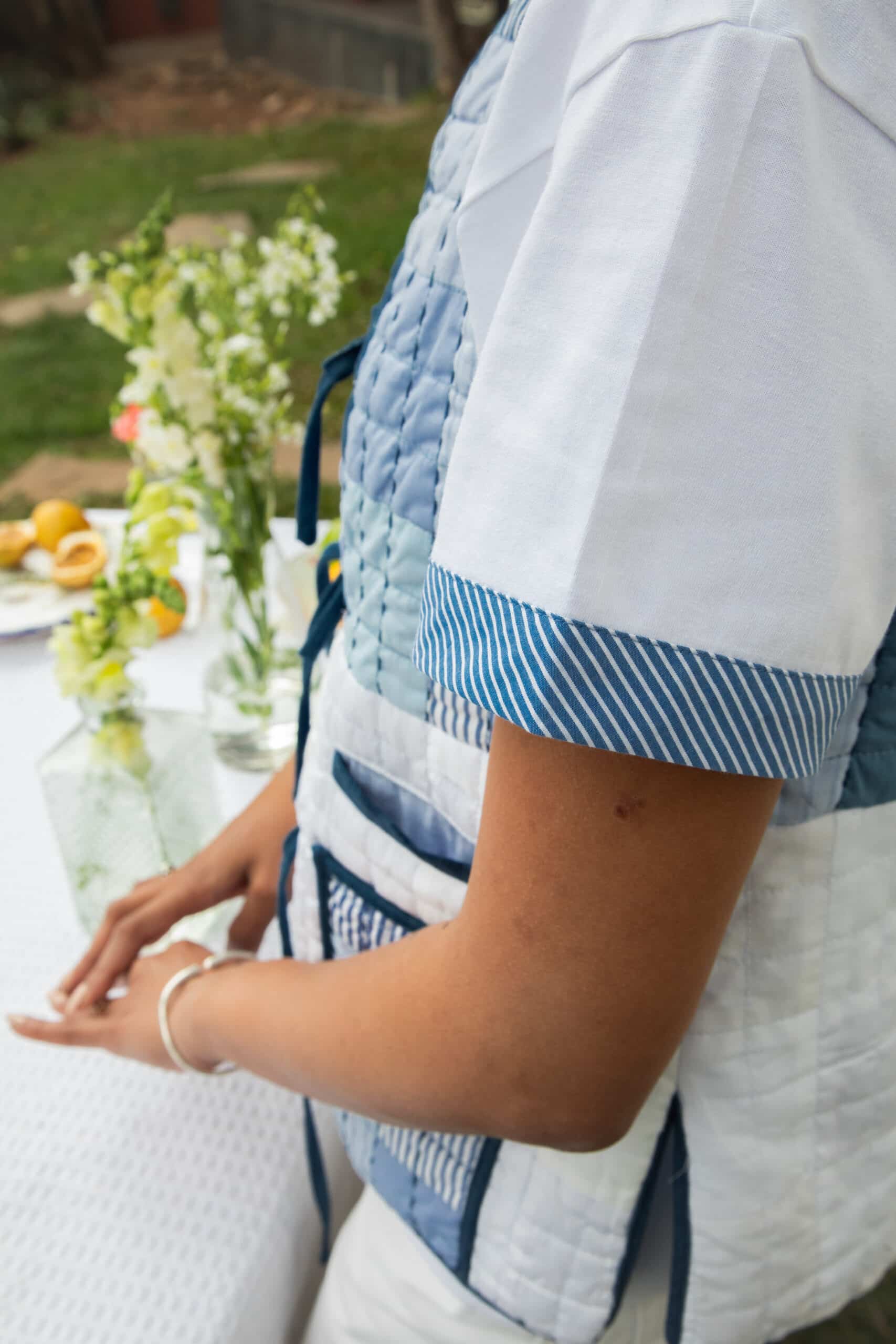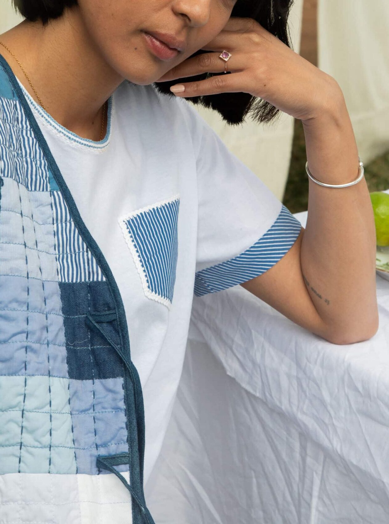 Sa poche rayée, également issue de la récupération, est sublimée par des détails au crochet faits à la main sur ses contours. Cette pièce se distingue par son caractère original et unique, en faisant un excellent basique qui se démarque tout en restant essentiel dans toute garde-robe.