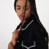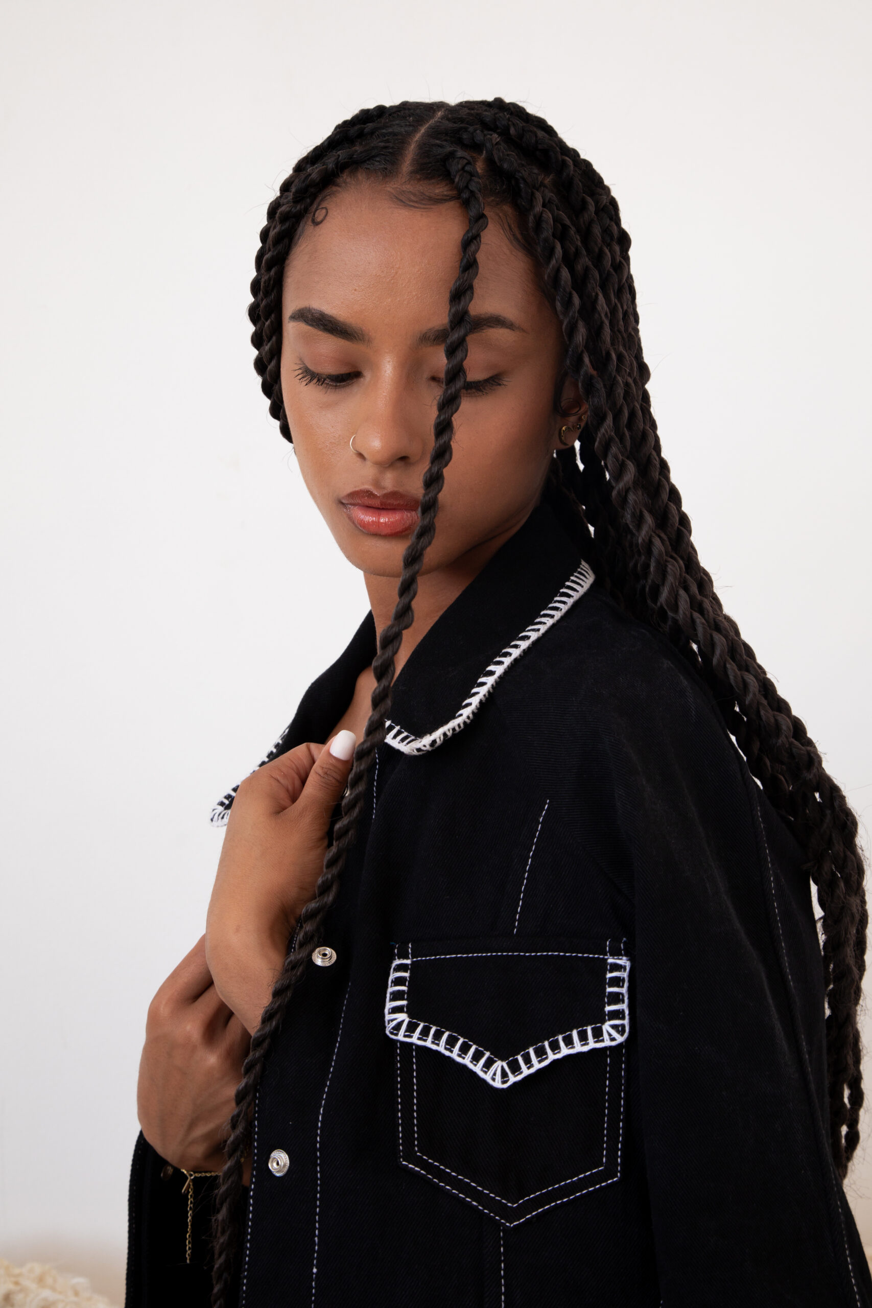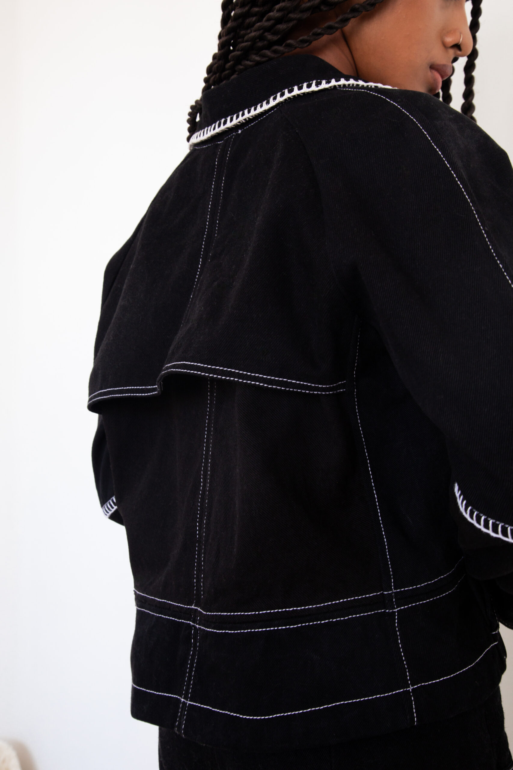 Notre veste LOVA en Denim noir upcyclé est une déclinaison plus sophistiquée de la veste Doria.
